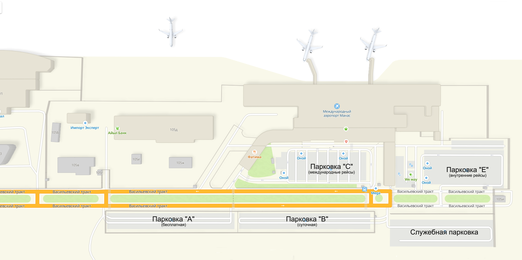 Аэропорттун унаа токтотуучу инфраструктурасы бир нече аймакка бөлүнгөн: